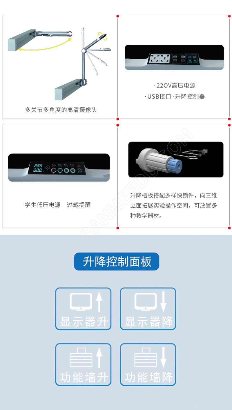 升降功能墻:內(nèi)置學生電腦、升降顯示器、兩個多關(guān)節(jié)多角度的高清攝像頭、USB插座、電源插座、控制開關(guān)、槽板、配合快鎖件等